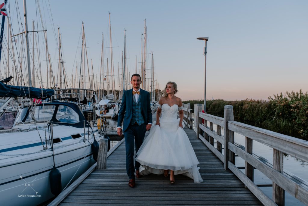 En doordat de dag zo ontzettend zonnig was, beloofde het laatste uur zon ook een bijzonder moment te worden. Lynnet en Ruben hadden op mijn aanraden gekozen om ook nog een fotoshoot te hebben bij ondergaande zon, een golden hour shoot. In de haven van Enkhuizen, net naast het Zuiderzeemuseum, hebben we vervolgens de zon zien zakken in de zee (of nouja, achter de huizen), waarna we onze spullen pakten en vertrokken naar de laatste stop van de dag: hun eigen achtertuin!