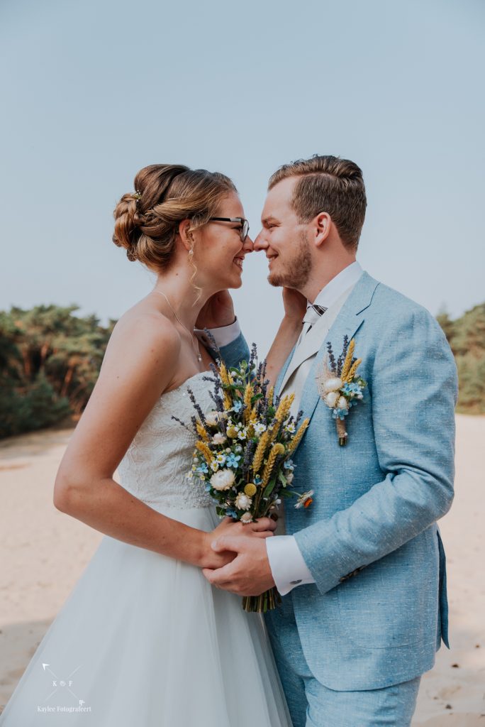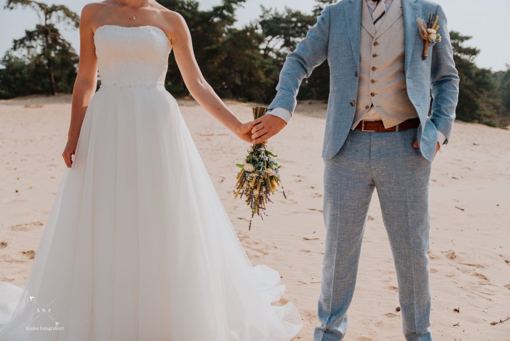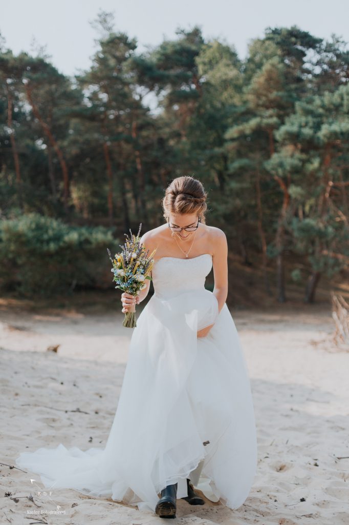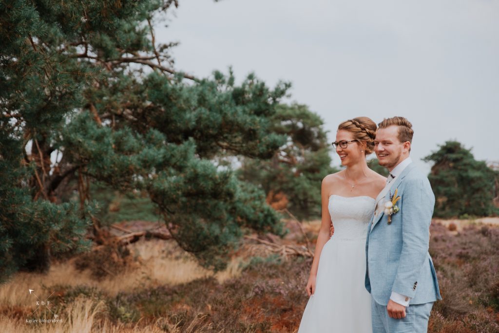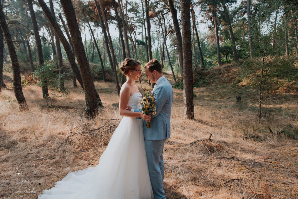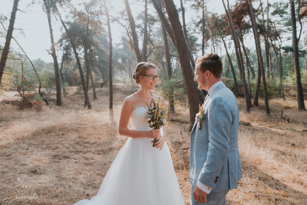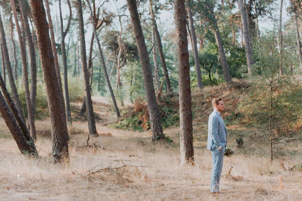 Het was een vroege ochtend op deze bruiloft: zelf was ik om half 8 bij de bruid in Lunteren, mijn second shooter kwam op datzelfde moment een aantal kilometers verderop aan bij de bruidegom in Arnhem. Na de opmaak en aankleedsessie, was het tijd om naar de eerste locatie te rijden: het bos/duinen bij Wekerom. Tijd voor de first look.. En wat was dat bijzonder! Als trouwfotograaf hoop je alleen maar op dit licht… Terwijl de zon tussen de bomen door priemde, stond Benthe achter Gerben. Klaar om hem op z’n rug te tikken.